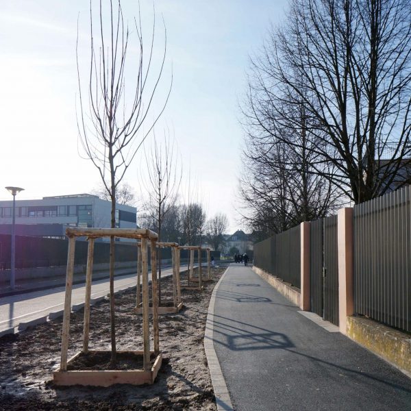 L’opération de déminéralisation permet ici de clarifier le mode de circulation des automobilistes et des cyclistes, tout en sécurisant les piétons grâce à un trottoir élargi côté collège, épaulé par de généreux espaces végétalisés. Légèrement en creux, ce large espace planté récupère les eaux pluviales du trottoir et d’une partie de la voirie, tout en offrant une riche palette de plantes aromatiques et mellifères.