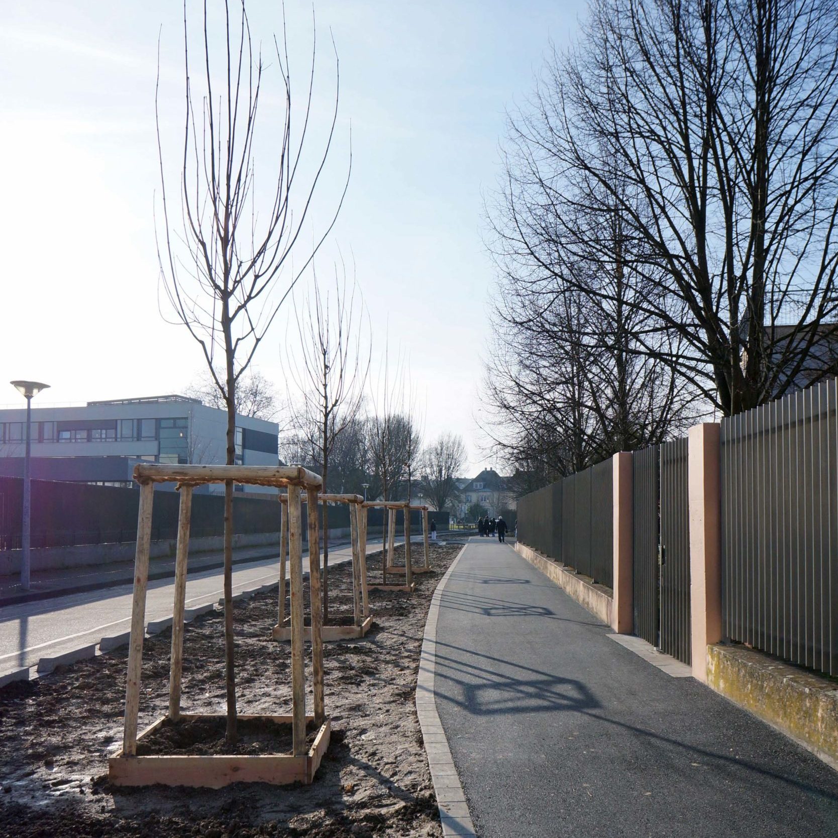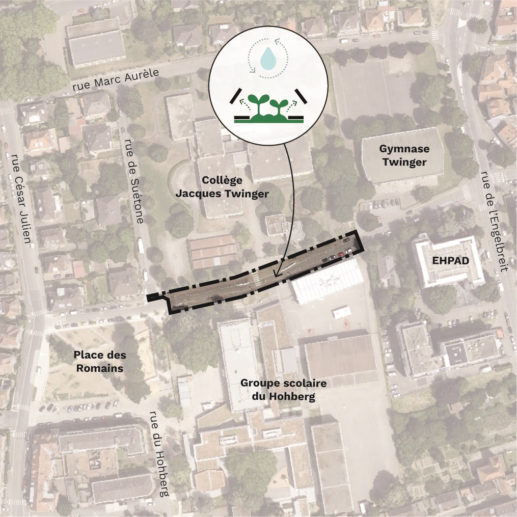 Programme : Cette opération tactique a pour objectif premier de déminéraliser et de végétaliser l’espace public, pour contribuer à l’adaptation de la ville face aux enjeux climatiques et participer à la réduction des îlots de chaleur. Un second objectif du projet, qui découle du premier, est la sécurisation du parvis du collège Twinger par rapport à la circulation automobile qui restera en sens unique Est -> Ouest.