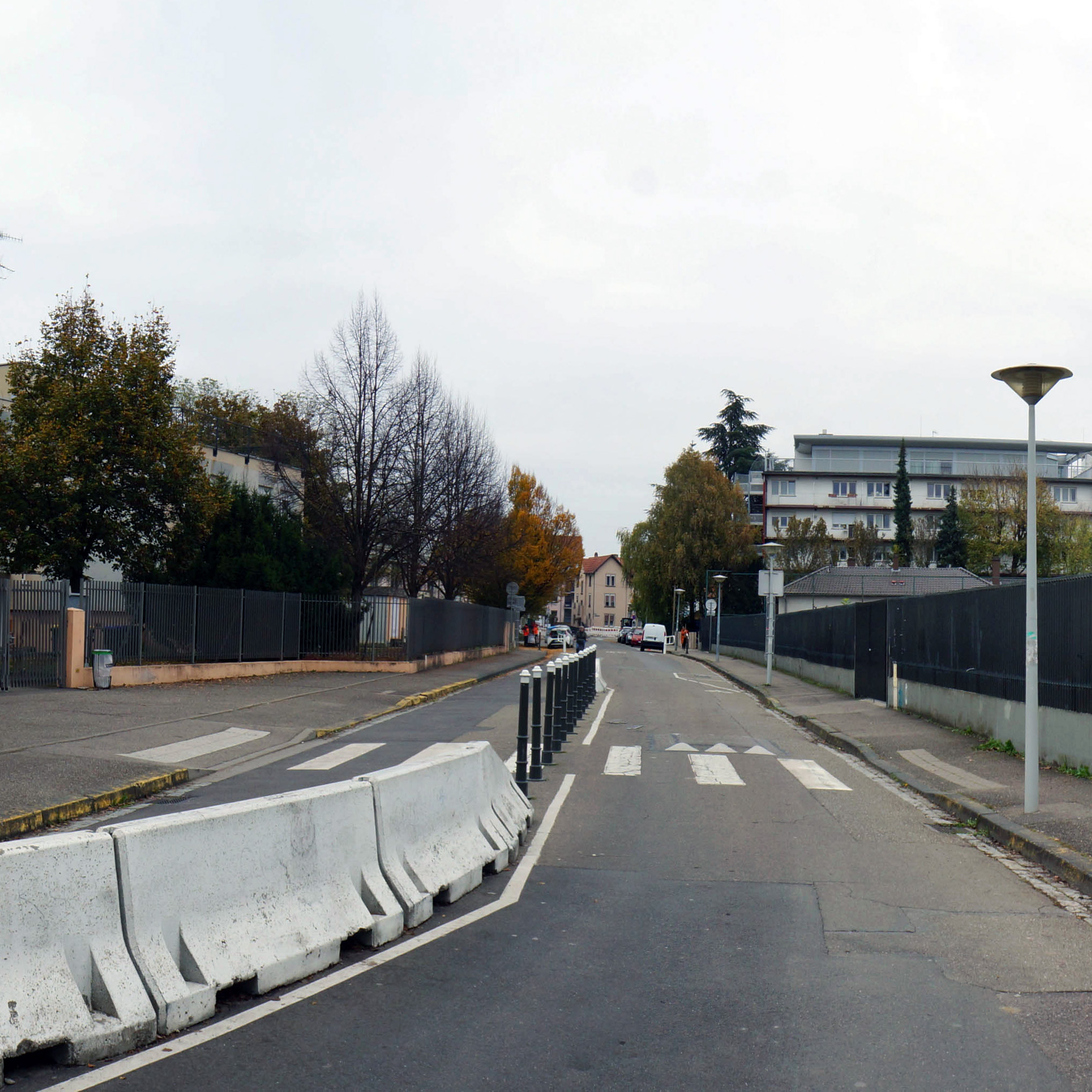 La rue dans sa situation initiale présentait un profil traditionnel 100% minéral fait pour la voiture, sur lequel des essais d’adaptation pour sécuriser les déplacements des nombreux élèves des établissements scolaires riverains s’étaient traduits par un amoncellement de dispositifs visant à cadrer et à limiter la voiture.