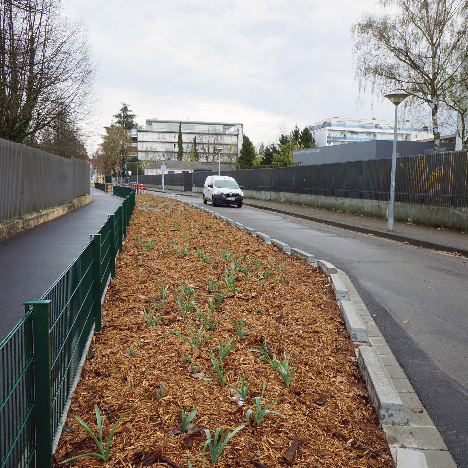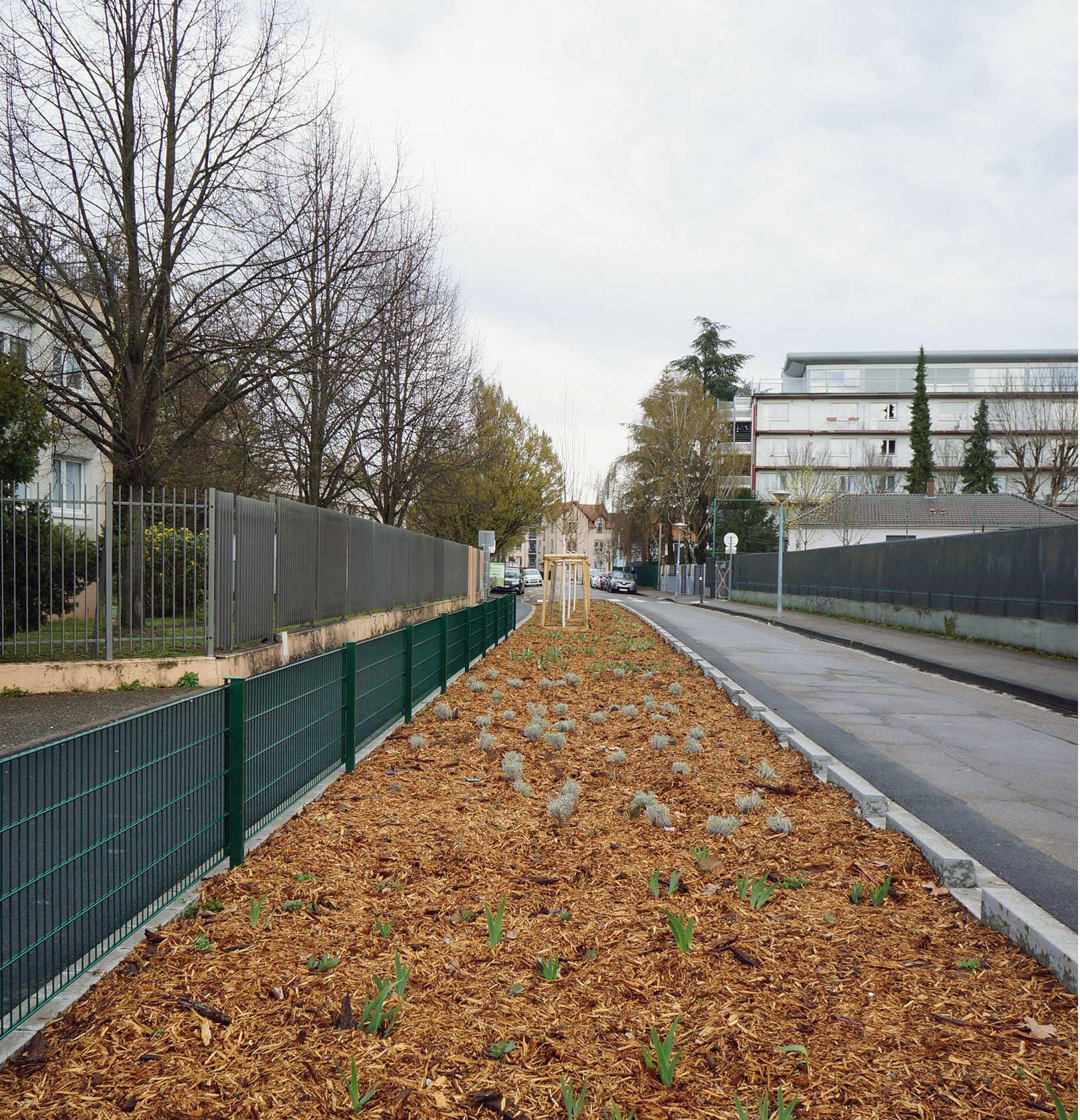 L’opération de déminéralisation permet ici de clarifier le mode de circulation des automobilistes et des cyclistes, tout en sécurisant les piétons grâce à un trottoir élargi côté collège, épaulé par de généreux espaces végétalisés. Légèrement en creux, ce large espace planté récupère les eaux pluviales du trottoir et d’une partie de la voirie, tout en offrant une riche palette de plantes aromatiques et mellifères.